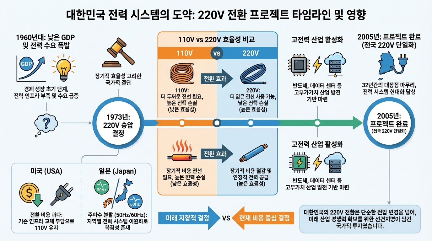 한국의 220V 전압 전환은 단순한 기술 변경이 아니었습니다. 1960년대 110V의 비효율성을 넘어, 미래의 국가 경쟁력을 설계한 과감한 전략이었죠.