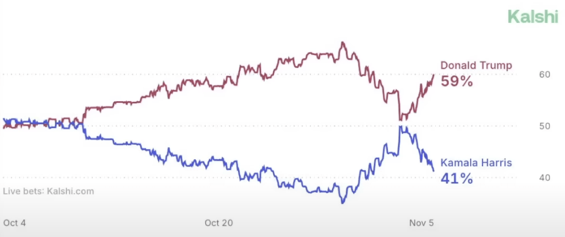 폴리마켓에서는 트럼프의 승리 가능성이 61%로 해리스 부통령의 38%를 앞서고 있으며, 칼시에서도 트럼프의 승리 확률이 59%로 해리스의 41%를 상회하고 있습니다.