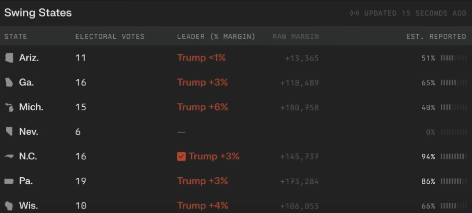 현재 트럼프는 주요 경합 주에서 최소 1%에서 최대 6% 정도 앞서고 있습니다. 노스캐롤라이나는 개표율이 94%에 도달했고, 트럼프의 승리가 거의 확실해 보입니다. 물론 네바다는 아직 개표가 많이 진행되지 않았지만, 지금까지의 추세로는 트럼프가 이길 가능성이 큽니다.