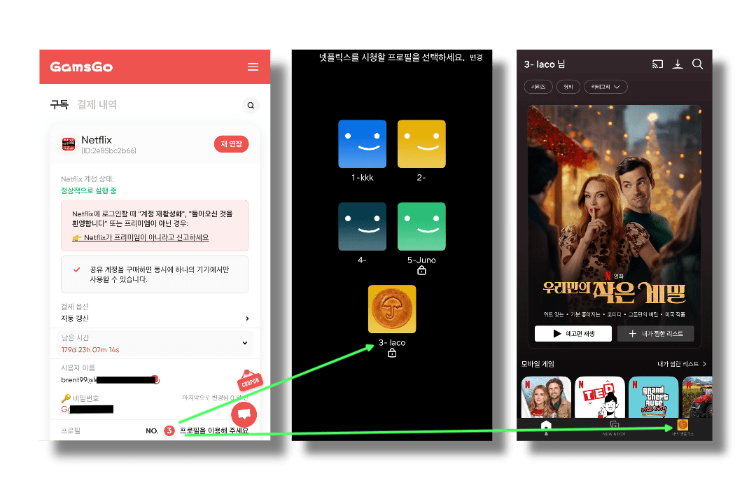이 구독 정보에는 사용자 이름, 비밀번호, 프로필 번호가 포함되어 있어요. 이 정보들은 넷플릭스 로그인할 때 사용되니까 잘 메모해 두세요.