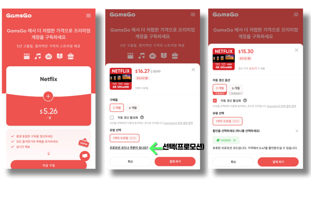 또한, Gamsgo는 불법적인 서비스가 아니에요. 엄격한 규정을 지키며 합법적으로 운영되기 때문에 안심하고 사용할 수 있어요. 이렇게 믿을 수 있는 플랫폼을 통해 넷플릭스를 더 저렴하게 즐길 수 있다면, 정말 좋은 기회가 아닐까요?
