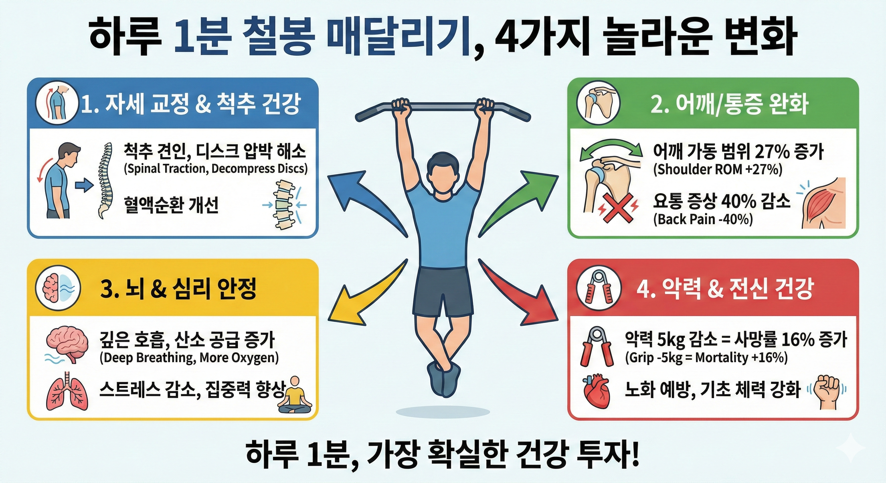여러분, 혹시 하루 1분 철봉에 매달리기만 해도 몸에 엄청난 변화가 찾아온다는 사실, 알고 계셨나요? 복잡한 운동기구도, 비싼 헬스장 등록도 필요 없습니다. 단지 '매달리기' 하나로 자세, 척추