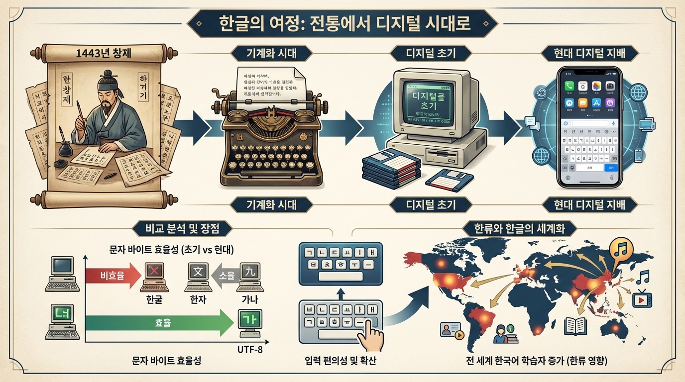 일본/중국이 겪는 '디지털 문맹' 문제를 한글은 극복했습니다. 방대한 한자 암기 부담 없이 누구나 쉽게 배우고 높은 문해력을 자랑하죠.