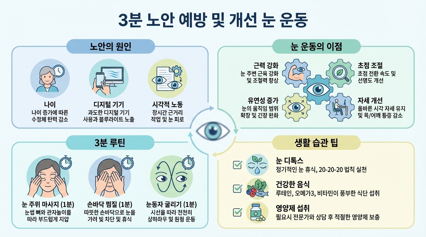 하루 3분, '저속 노안' 시대를 위한 작은 투자로 더 선명하고 활기찬 삶을 경험하세요. 자세한 운동법과 눈 건강 가이드는 블로그 포스팅에서 확인해보세요!