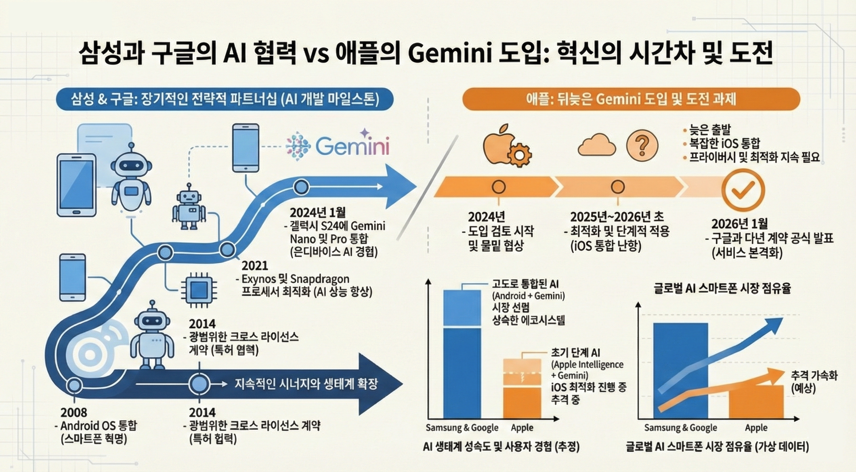 특히 주목할 점은 구글 제미나이가 이미 삼성 갤럭시 S24에 탑재되어 그 성능을 입증했다는 사실입니다. 삼성과 구글은 2008년부터 시작된 18년간의 굳건한 동맹을 통해 AI 최적화에 대한 독보적인 노하우를 쌓아왔습니다. 구글 AI를 삼성 하드웨어에 완벽하게 녹여내기 위한 수년간의 공동 개발 과정은 애플이 단기간에 따라잡기 힘든 견고한 진입 장벽이 되고 있습니다.