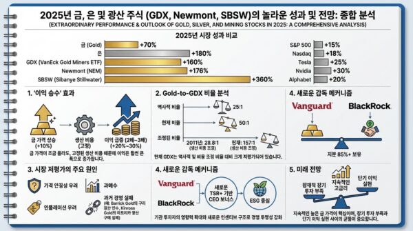 2025년 AI 열풍 속에서도 금과 은, 그리고 금광 회사들의 주가가 보여준 놀라운 상승률. 특히 GDX ETF가 160% 폭등한 배경에는 금값 상승의 단순한 효과를 넘어선 복합적인 시장 심리와 경영 구조 변