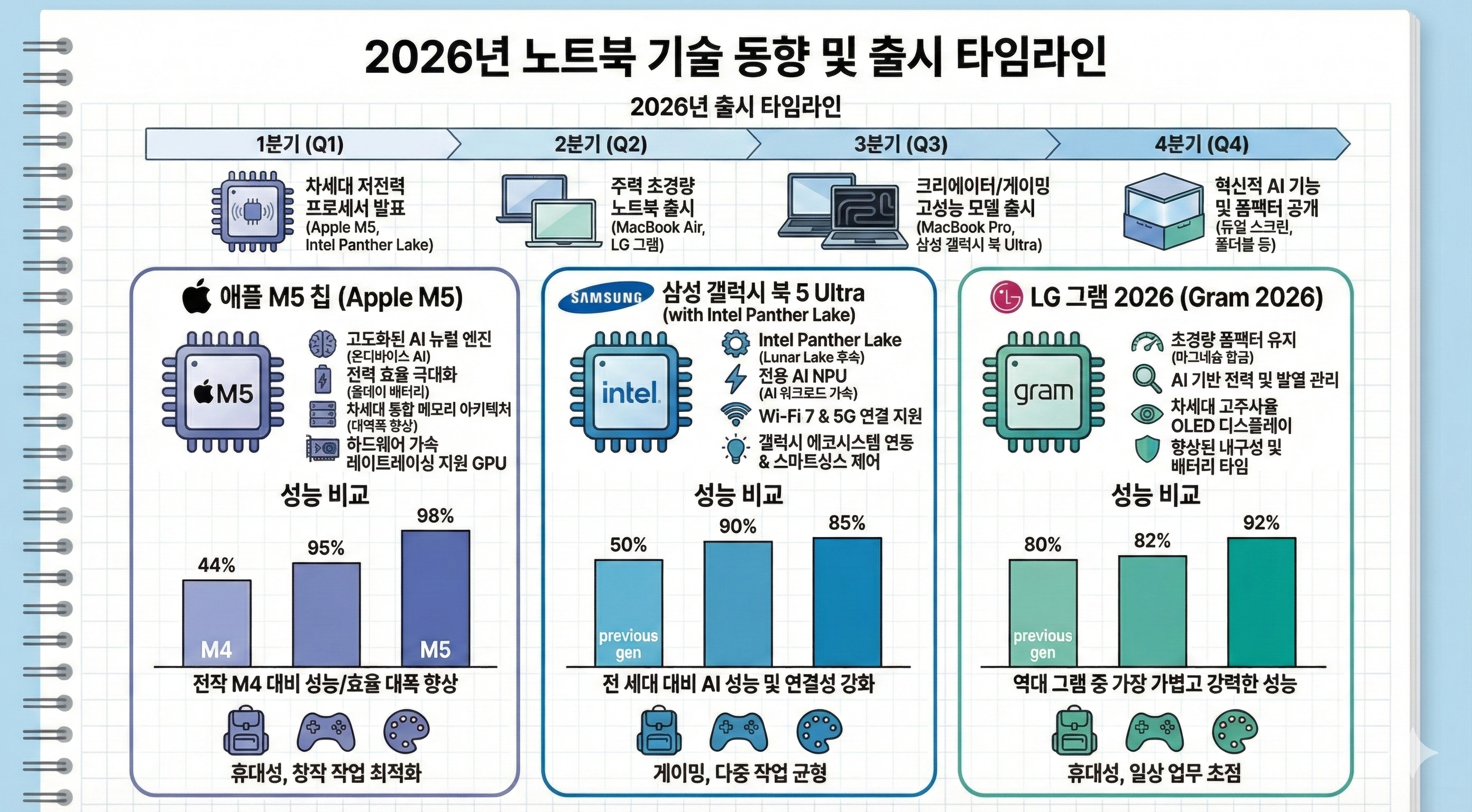 2026년 노트북 시장은 혁신적인 변화를 예고하고 있습니다. 애플의 가성비 맥북 루머부터 삼성 갤럭시 북의 인텔 팬서 레이크 탑재, 그리고 LG 그램의 AMD 협력까지, 주요 브랜드들의 새로운 전략