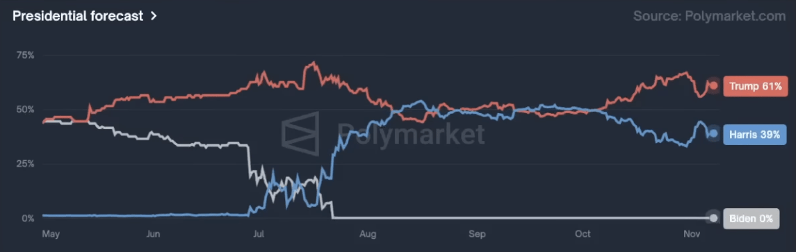 폴리마켓에서는 트럼프의 승리 가능성이 61%로 해리스 부통령의 38%를 앞서고 있으며, 칼시에서도 트럼프의 승리 확률이 59%로 해리스의 41%를 상회하고 있습니다.